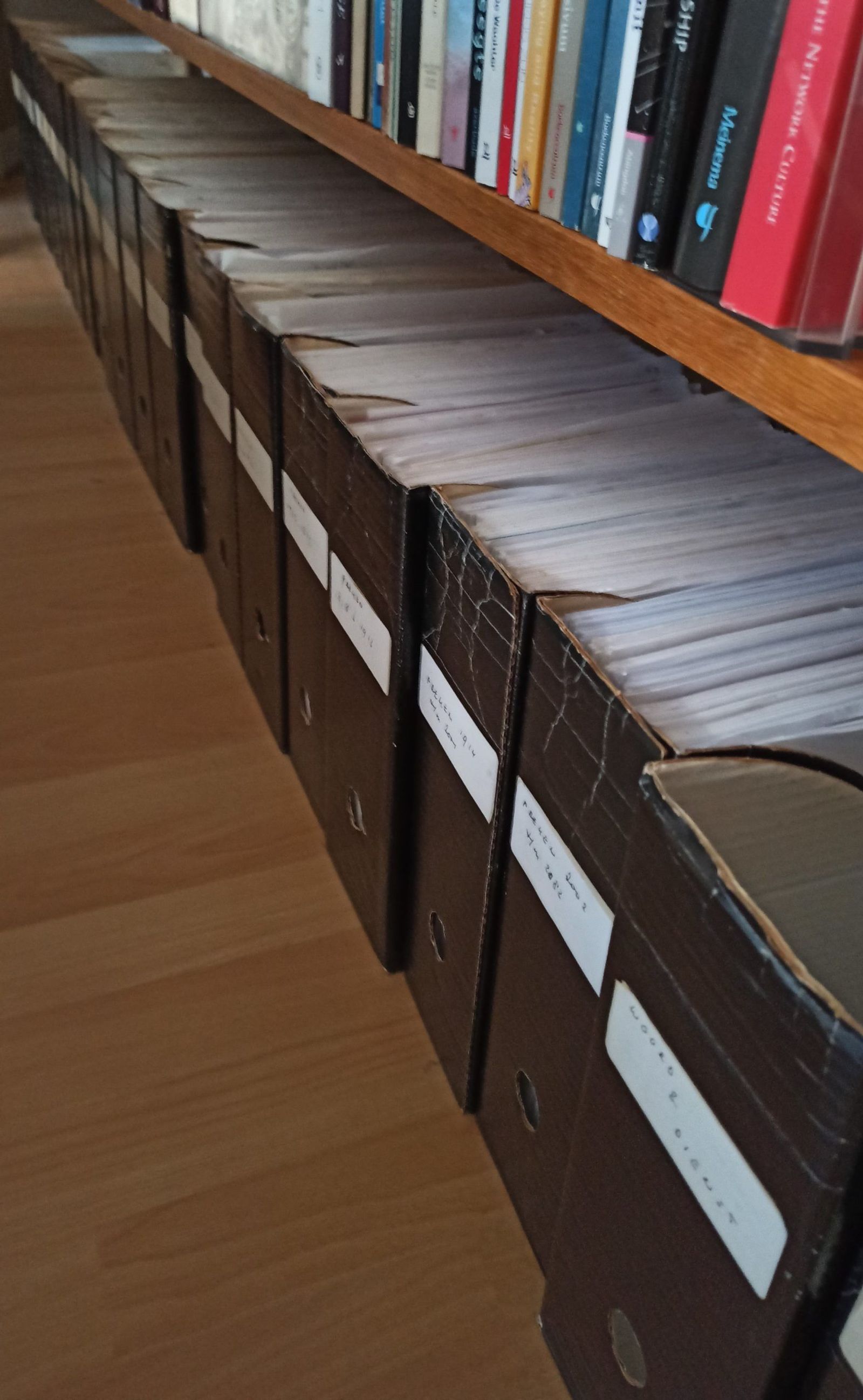 mijn boekenkast: het muurtje van archiefdozen met preken. Eerst één, toen twee.