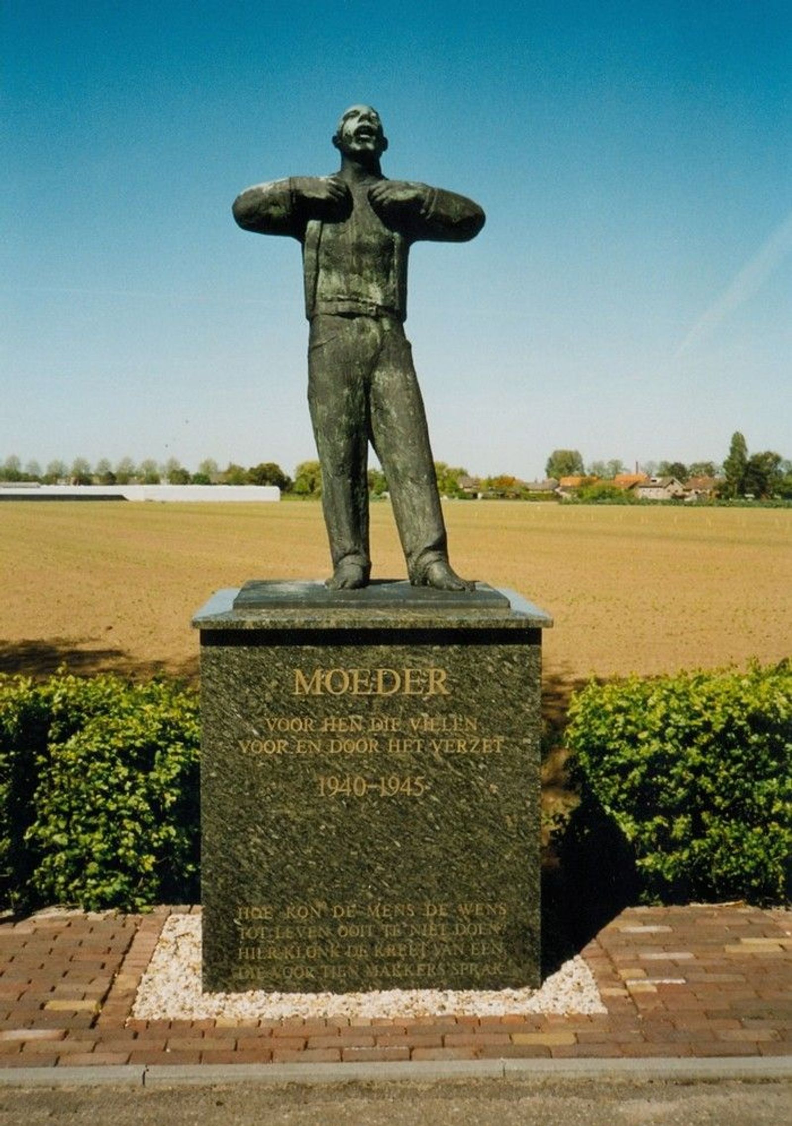 Nee, dan Heinenoord. Daar staat langs de provinciale weg een oorlogsmonument getiteld ‘Moeder’. Het beeldt een jongeman uit die voor het vuurpeloton schreeuwt om zijn moeder. Elk jaar wordt op 4 mei tegen achten de provinciale weg even afgesloten voor alle verkeer. Uit het dorp in de verte komt een kleine stoet aangelopen. Voorop de donker klinkende trommels die bij zo’n gelegenheid horen. Daarachter de burgemeester en andere prominenten van het dorp.