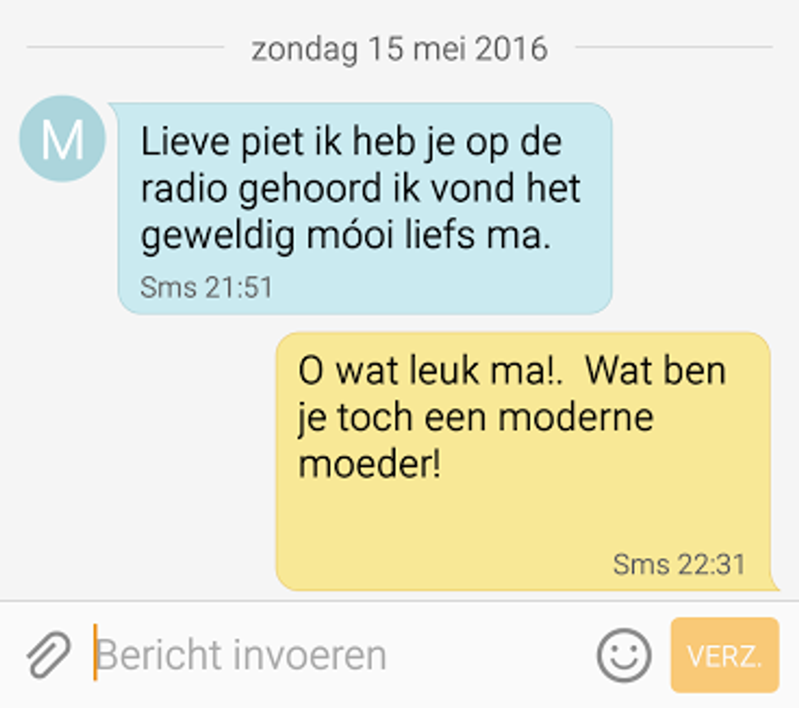 Zo gezegd, zo gedaan. Om 21:51 uur kreeg ik een sms-je. ‘Lieve Piet, ik heb je op de radio gehoord. Ik vond het geweldig mooi. Liefs, ma.’ Ze had op haar radio kennelijk 3FM weten te vinden en was blijven luisteren naar al die voor haar vreemde muziek tot ik aan de beurt was.
