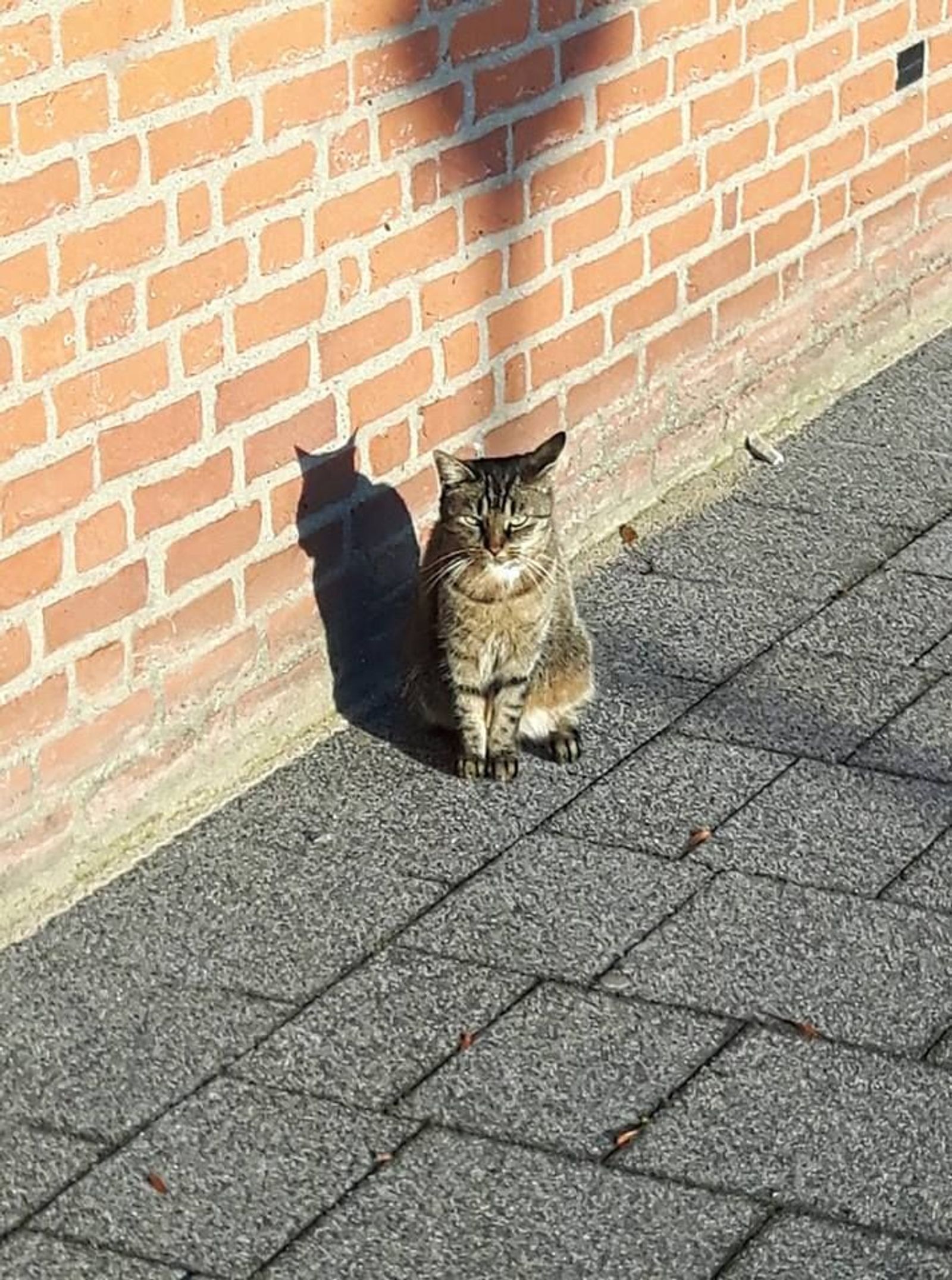 Hij is geen lid van onze kerk, maar wel onze meest trouwe kerkganger. Hoewel hij nooit binnenkomt. Ra, ra, wie of wat is het? Het is onze kerkkat. Hij slaat geen kerkdienst over. Voor aanvang is hij altijd te vinden op ons pad.