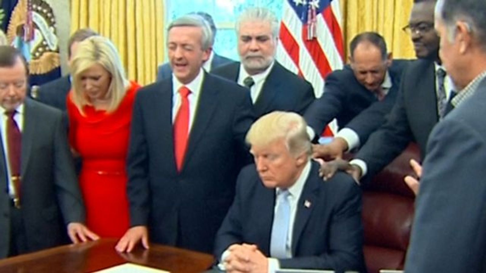 Robert Jeffress is daarvan wel het meest flagrante voorbeeld. Deze voorganger van een evangelische megakerk in Dallas verafgood Trump bijna. Bekijk het gebed maar eens dat hij in de Oval Office uitsprak. Jeffress viel Trump ook meteen bij na diens oorlogstaal jegens Noord-Korea (‘fire and fury’).