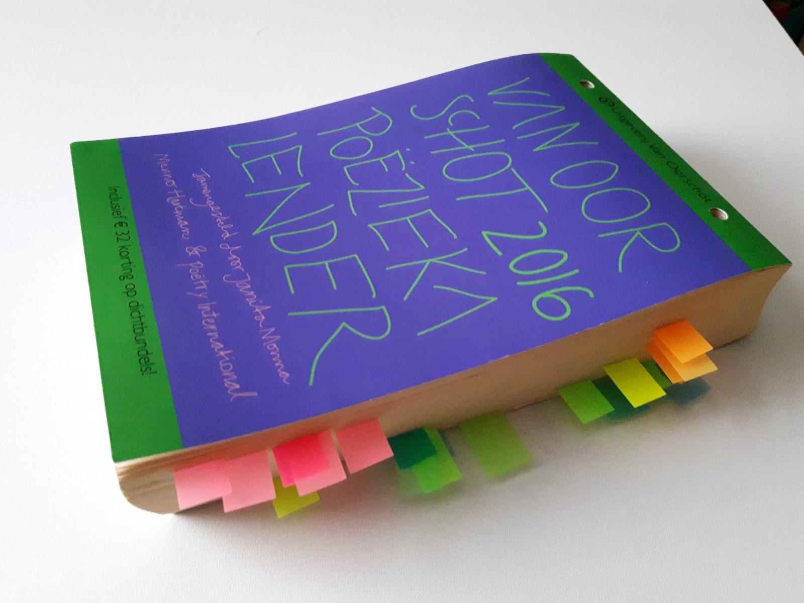 Ik ontwikkelde de gewoonte om, als een gedicht me aansprak, zo’n gekleurd stripje bij het gedicht te plakken. U kent ze wel, van die handige strookjes om te gebruiken als een soort tabbladen. Je kunt meteen terugvinden wat je belangrijk vond. U begrijpt inmiddels ook dat ik de gedichten er dus niet uitscheur. Zonde!