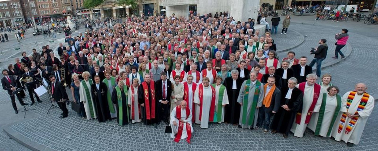 Dat moet een apart gezicht geweest zijn. Amsterdammers en toeristen zullen opgekeken hebben: witte, zwarte, grijze en blauwe toga’s namen bezit van het plein. Vervolgens werd de groepsfoto gemaakt. Het past bij de trend: predikanten willen meer zichtbaar worden in de samenleving.
