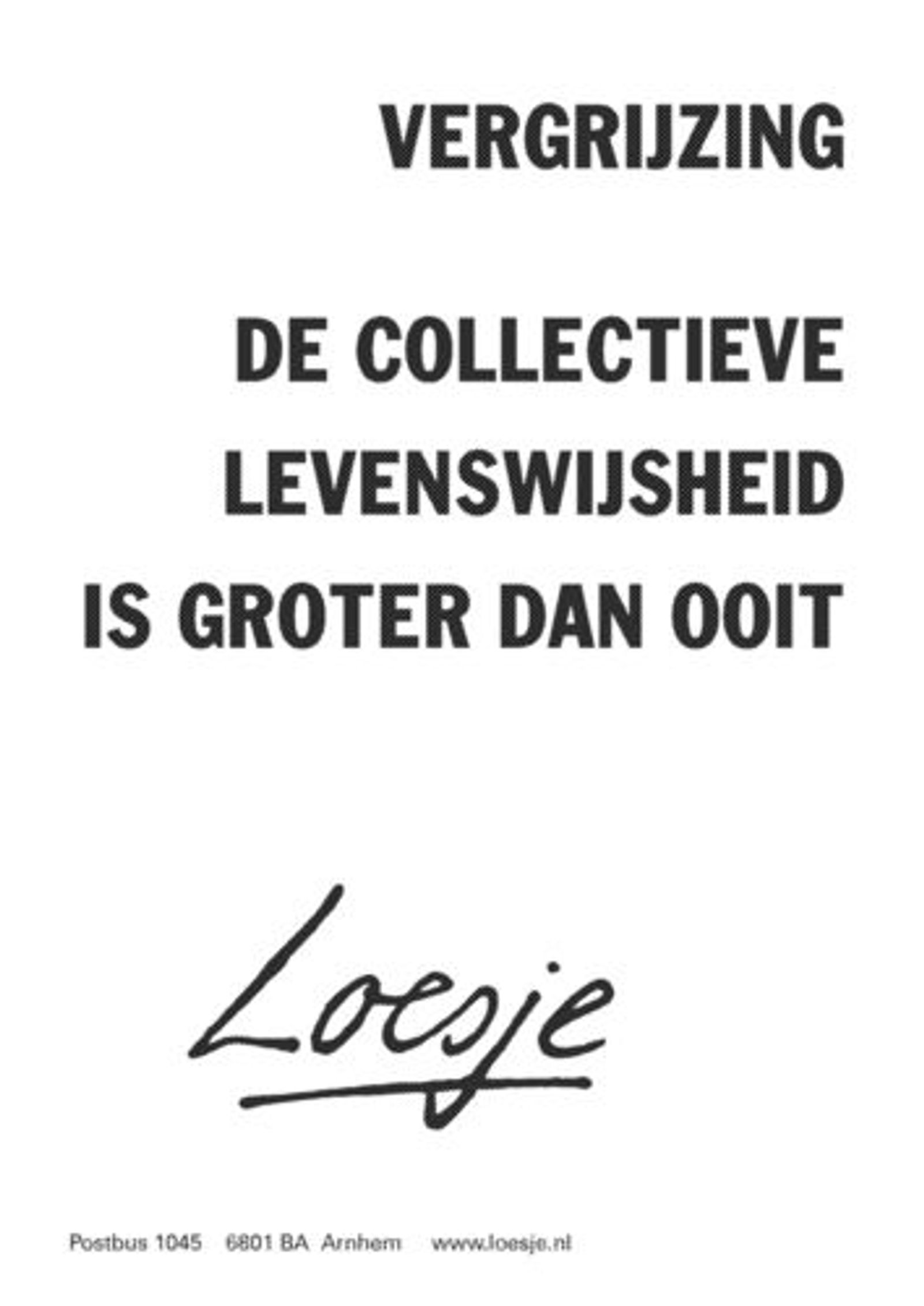 De laatste levensfase is niet de gemakkelijkste. 'Ouderdom komt met gebreken' - 'Je wordt wel ouwer maar niet gouwer': het zijn de platitudes over het oud-worden, maar wel waar. De kwetsbaarheid neemt toe. Zintuigen laten het langzaam afweten. Je wordt strammer. Is het geloof dan een krachtbron? Vaak wel, maar soms ook niet. We horen er over in een Psalm. Die laat ook zien dat het niet alleen kommer en kwel is. Zoals de tekst van Loesje hiernaast trouwens ook laat zien.