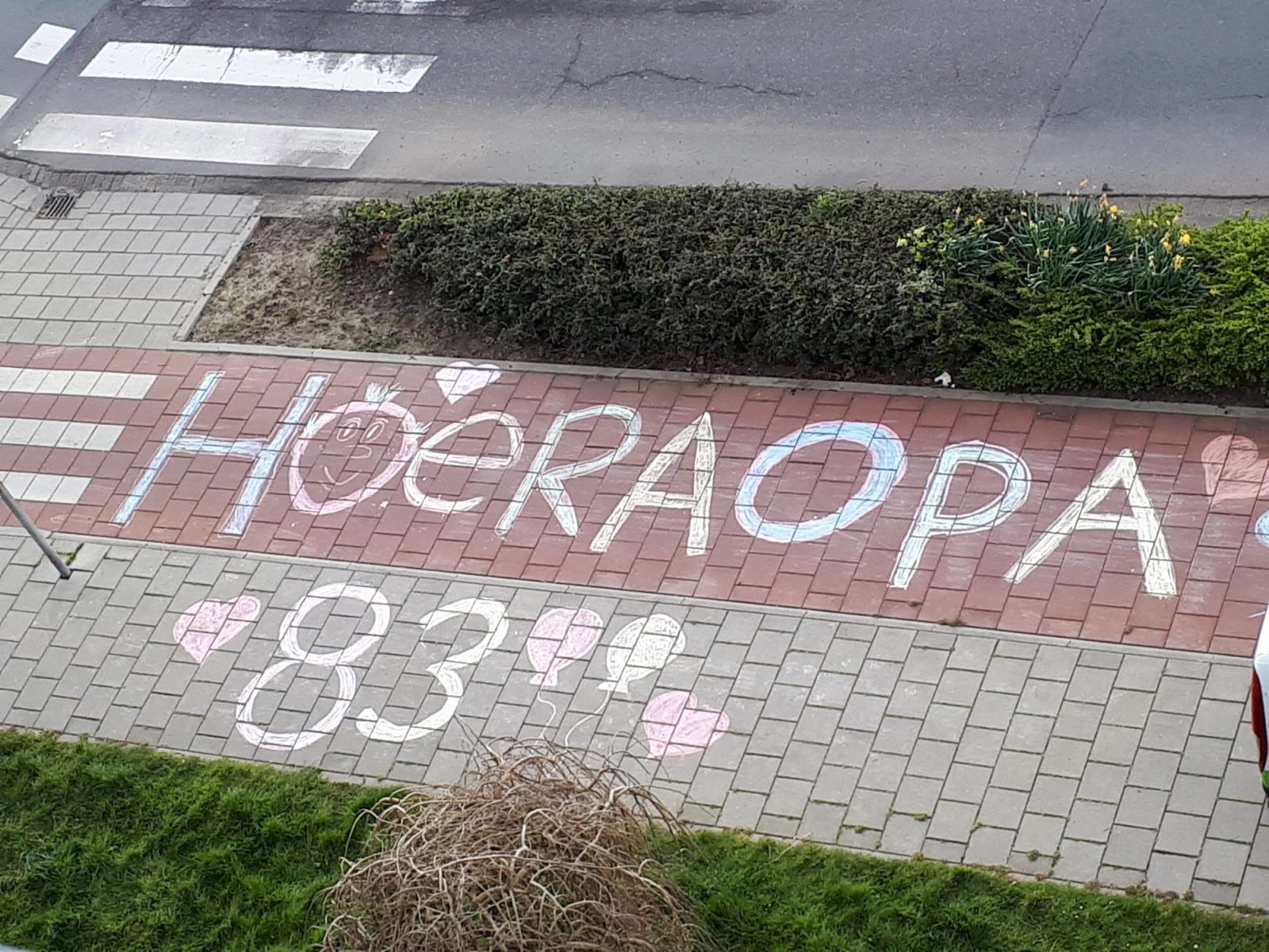 Er worden zelfs hoogwerkers ingezet om mensen dicht bij elkaar te brengen. En wat als er geen hoogwerker is? Kijk naar de foto. Ik maakte hem vanaf het balkon bij mijn moeder. Een medebewoner in haar flat was jarig. Er kon natuurlijk niemand op bezoek. Maar de kleinkinderen vonden er wat op.