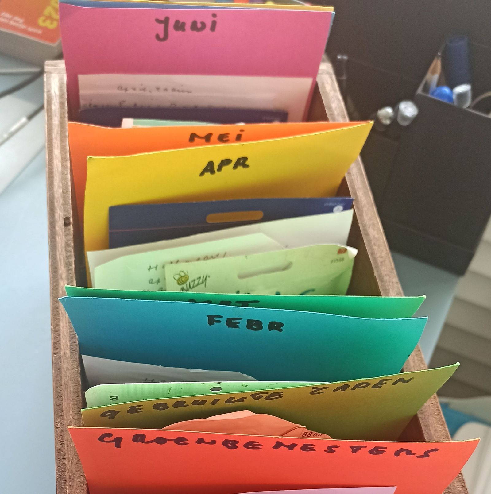Na het zaaiplan en het bestellen van de zaden is het zaak al die zaden in een bakje op de juiste volgorde van zaaitijd te zetten. De eerste zaden in februari, de laatste in juni (zie foto). Tussen die maanden hopen de zakjes zaad zich in mijn bak op. Er kan niets meer bij. Het enthousiasme van de beginnende tuinder zullen we maar zeggen. Want, man, wat heerlijk is alleen al dat plannen! Je staat al catalogiserend al te trappelen om te beginnen.