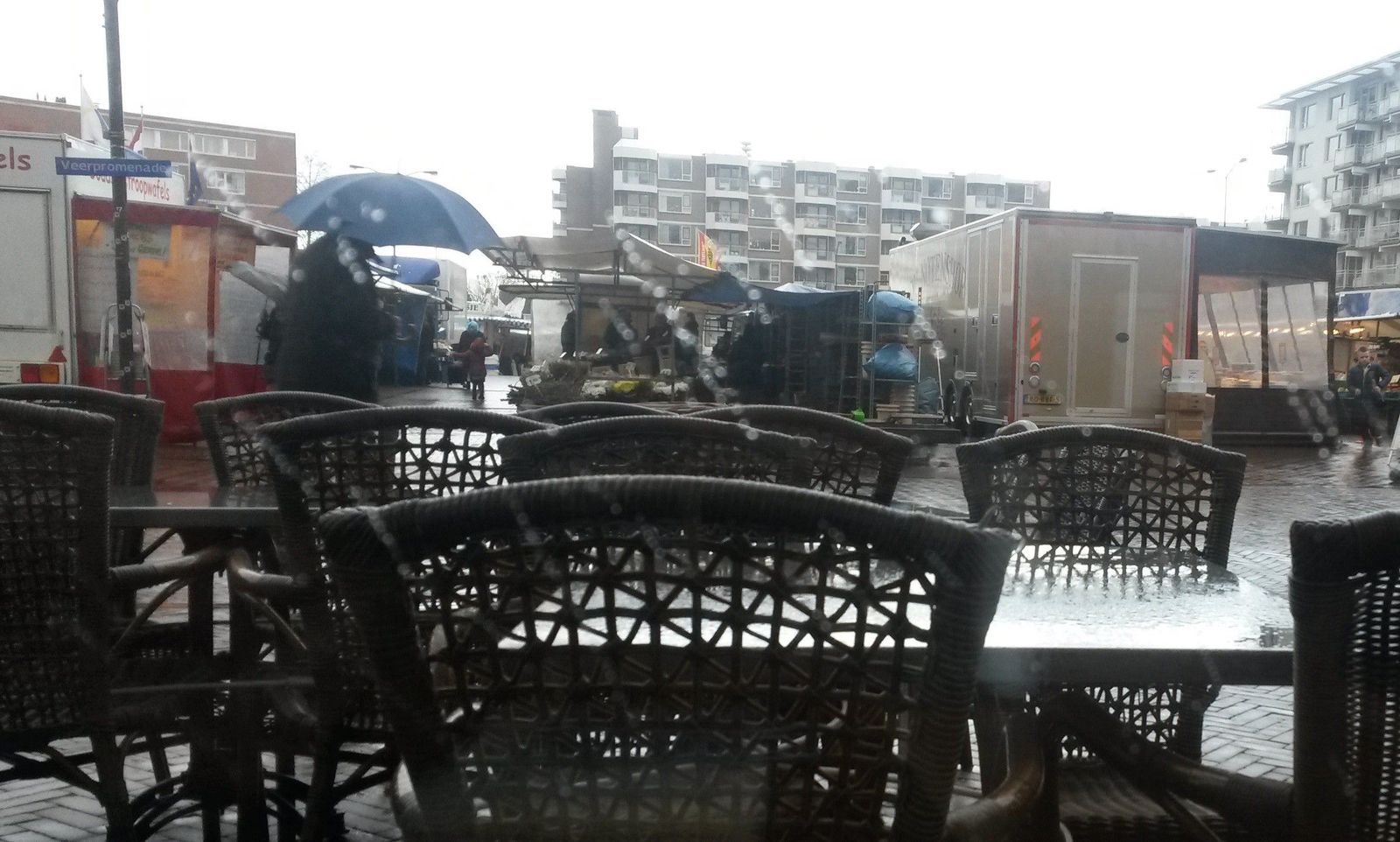 Dit keer was het echter niet druk. Vanaf mijn stoel bij het raam had ik uitzicht over het marktplein (zie foto). Een lage loodgrijze hemel leek het neer te drukken. De enkele voorbijganger spoedde zich onder zijn paraplu door de vlagerige miezerregen naar de winkels of huiswaarts. ‘Geen klandizie vandaag,’ dacht ik.